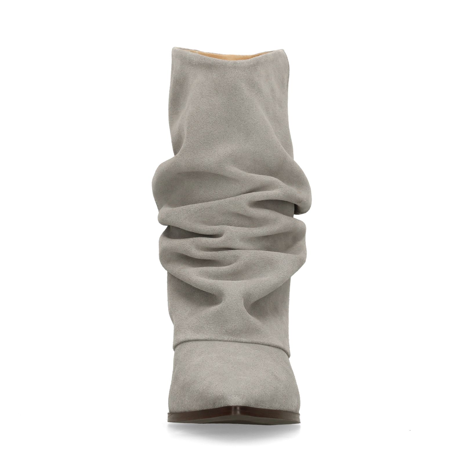 Grijze suède slouchy enkellaarsjes van Manfield. De enkellaarsjes hebben een hak van 6 cm. De enkellaarsjes hebben een puntige neus en een afzak effect. De laarzen hebben een schachthoogte van 22 cm en een schachtomtrek van 40 cm. We adviseren als bescherming en verzorging de suède/ nubuck spray in transparant.