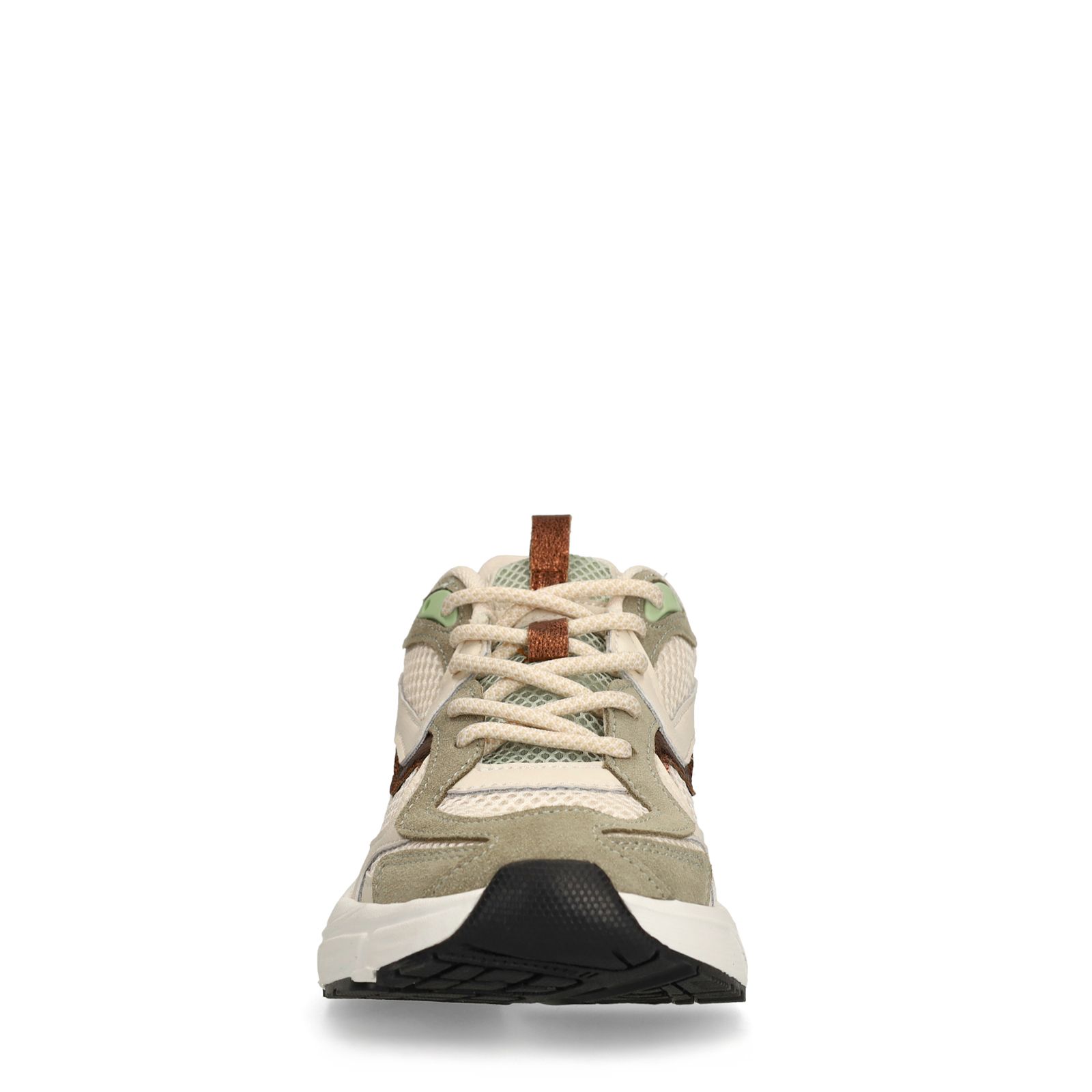Groene leren sneakers van Manfield met beige en bronzen details. De sneakers hebben een witte plateauzool van 4 cm en suède en mesh details over de schoen heen lopen. We adviseren als bescherming en verzorging de Collonil Carbon pro.