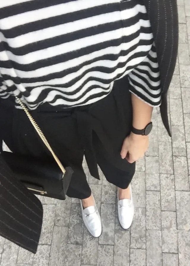 Zakelijke lunch of een chic feestje voor de boeg? Combineer de zilverkleurige loafer dan met een klassieke pantalon en een blazer. Netjes, maar in combinatie met een gestreepte top lekker quasi nonchalant. Ik stijl mijn outfit af met een stoer horloge en een elegante schoudertas voor een sophisticated twist.