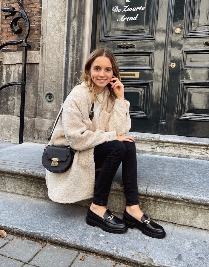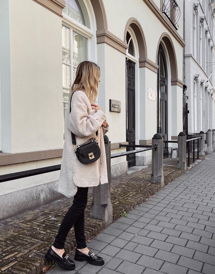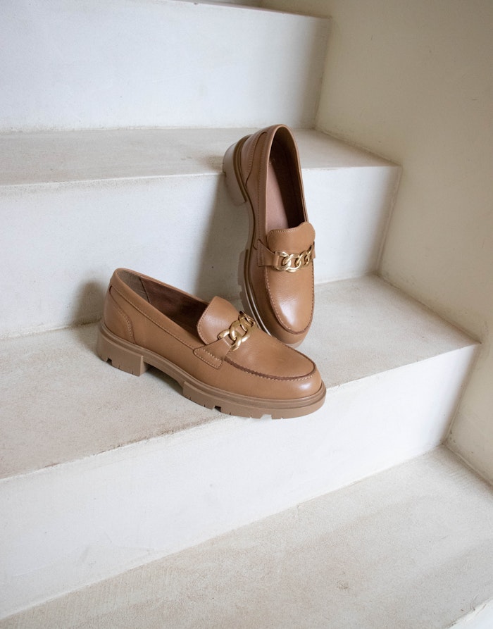 Cognac loafers met chain zijn perfect om te combineren met een donkere pantalon óf een winters jurkje. Een off white gebreid jurkje met loafers met chains is de perfecte combinatie tussen klassiek en vrouwelijk. Extra leuk: laat de cognac kleur van je loafers ook terugkomen in je handtas.