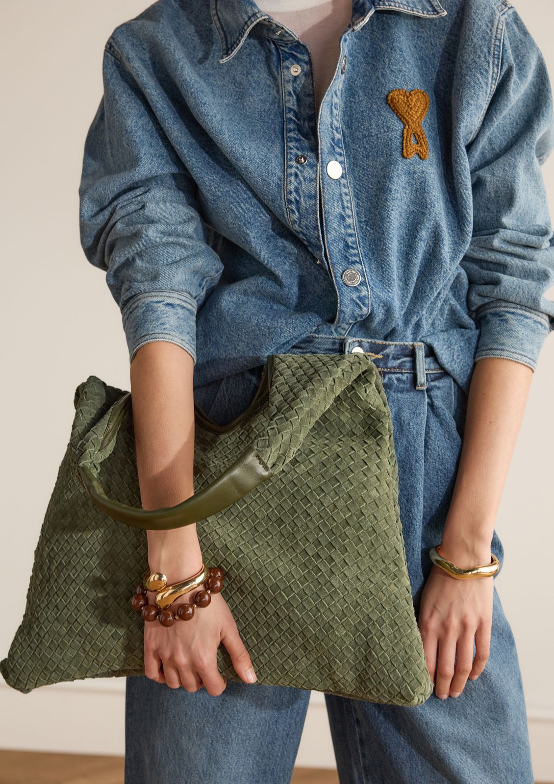 Khaki gevlochten suède schoudertas van Manfield met een drukknop sluiting. De afmeting van de tas is 50x30x20 cm (BxHxD), de schouderband lengte is 50 cm.