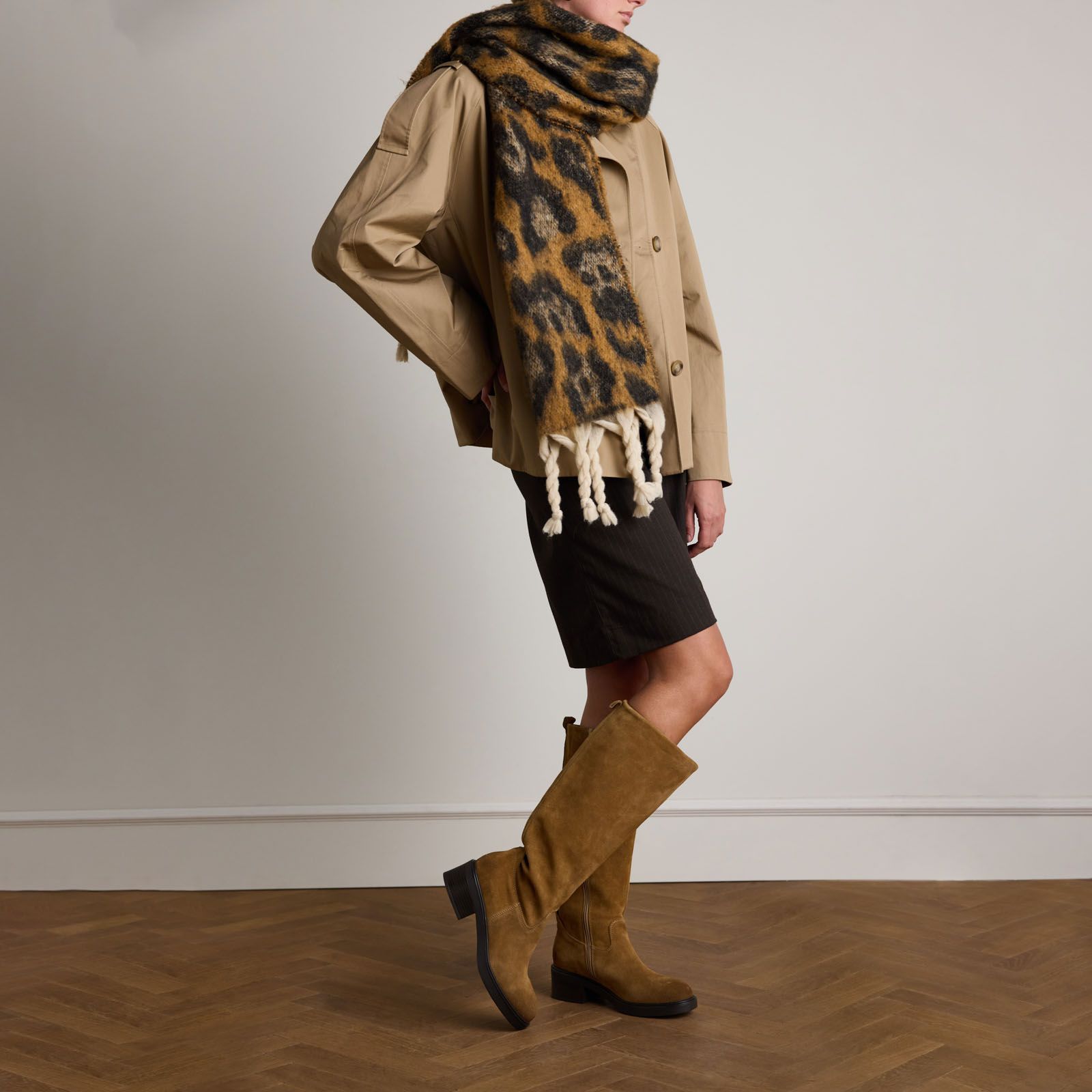 Leopard sjaal met witte details van Manfield. De sjaal heeft een totale lengte van 194 cm en een breedte van 45 cm.