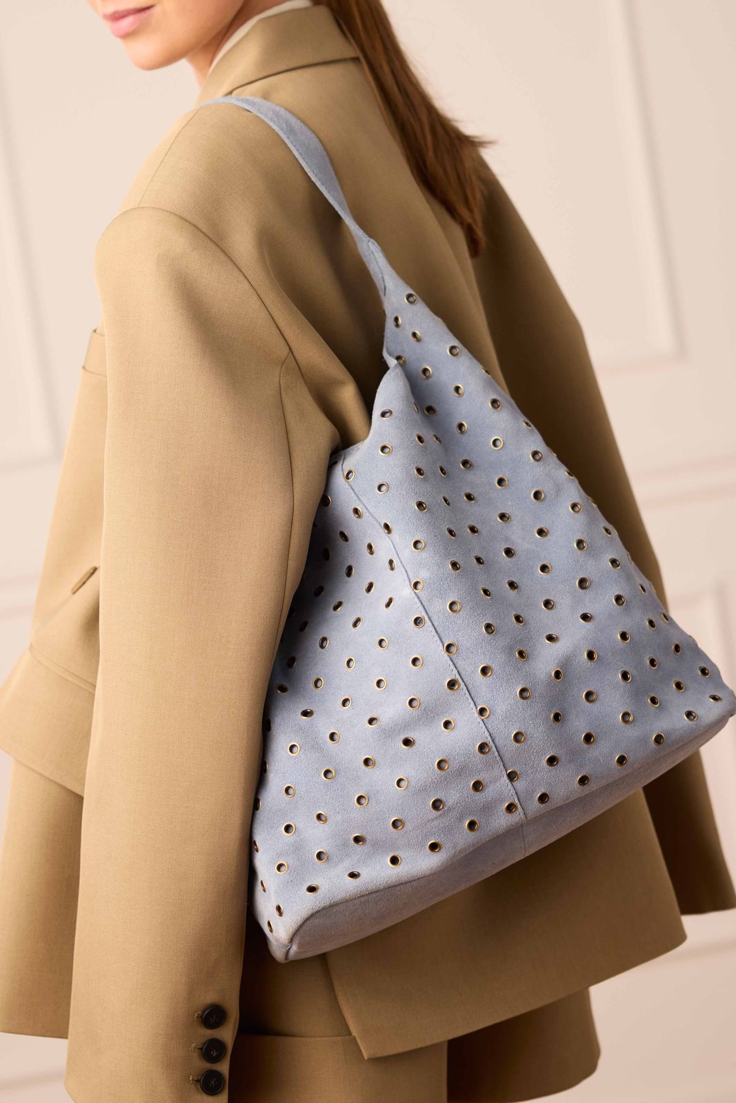 Licht blauwe suède schoudertas met zilveren studs