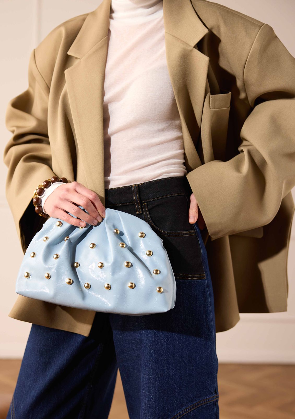 Lichtblauwe clutch met gouden studs van Manfield. De clutch heeft een dubbele drukknoopsluiting en gouden schouderband waardoor je de clutch op 2 manieren kan dragen. De afmeting van de clutch is 37x19x13 cm, (BxHxD).