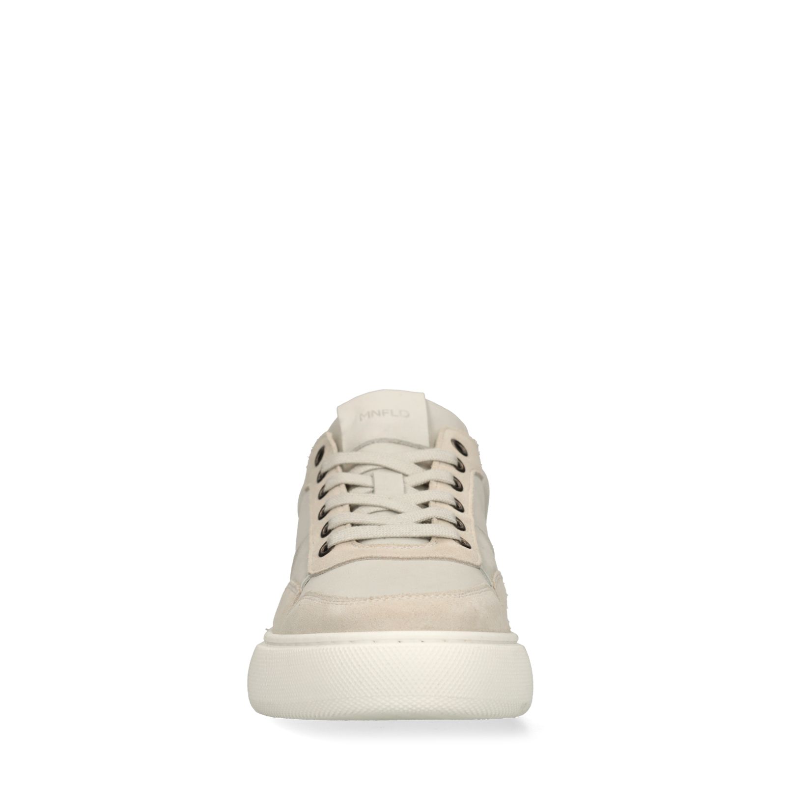 Off White nubuck sneakers van Manfield. De sneakers hebben een vetersluiting en witte plateauzool van 4 cm. We adviseren als verzorging en bescherming de Collonil Carbon Pro spray.
