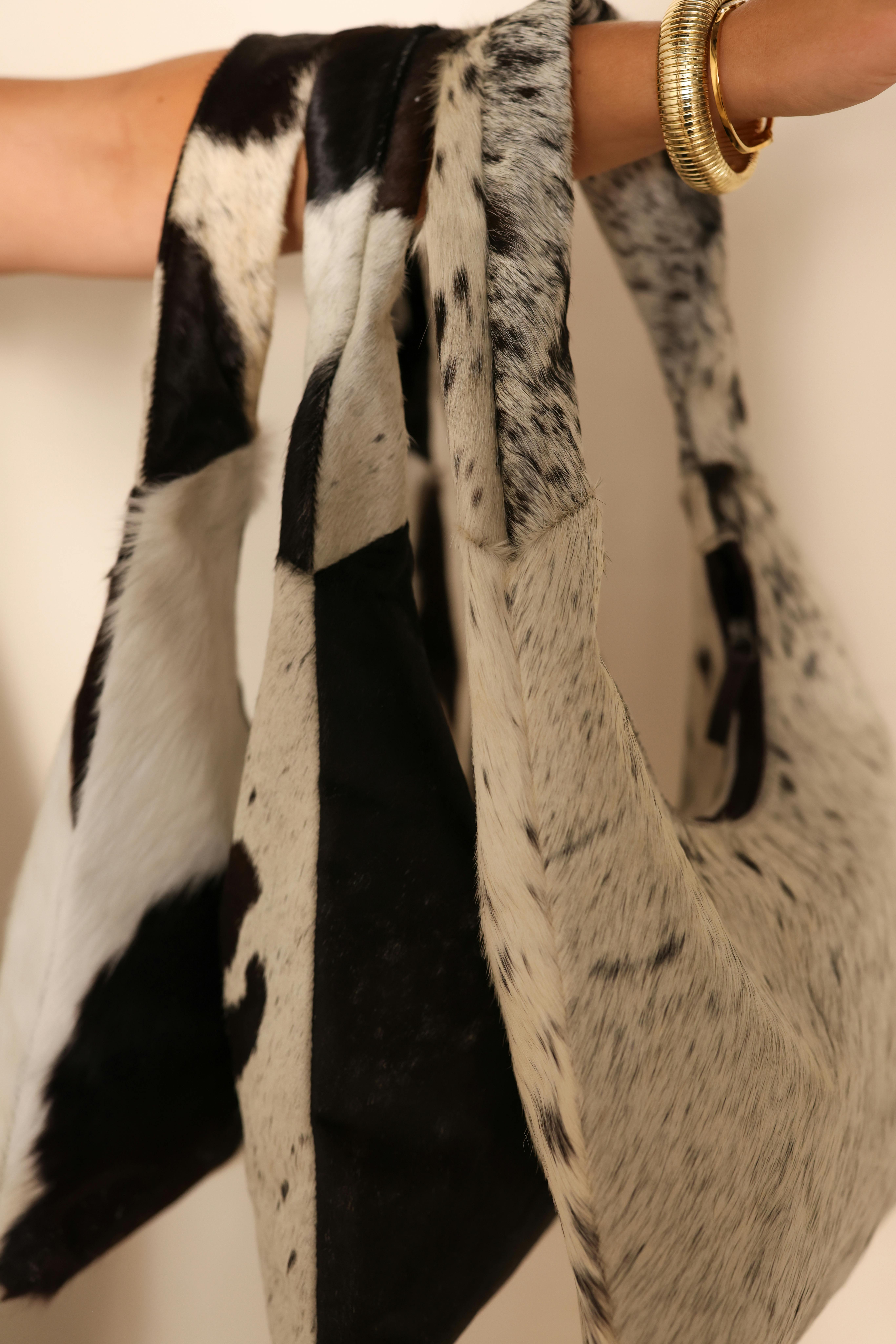 Schoudertas met cowprint van Manfield met een ritssluiting. LET OP - de tas is gemaakt van natuurlijk materiaal, hierdoor heeft elk item een unieke print. De afmeting van de tas is 37x25x4 cm, (BxHxD).