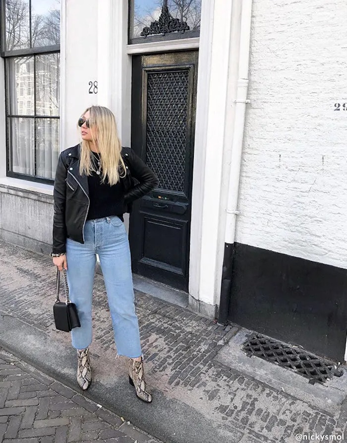 Ook dit najaar is een goede jeans onmisbaar in iedere garderobe. Zo’n broek staat bovendien erg stijlvol in combinatie met een paar slangenprint schoenen. Hou de rest van je outfit ingetogen zodat de schoenen een echte eyecatcher zijn. Stijl je snakeskin boots met jeans, een effen knit en een leren jasje voor een modieuze outfit.