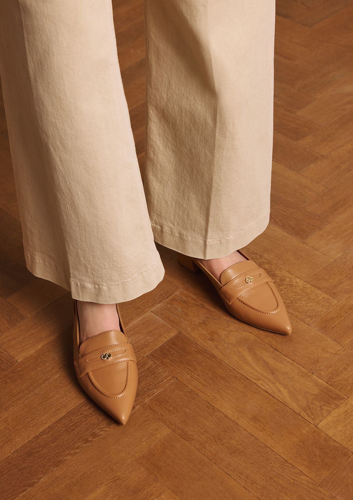 Taupe leren slingbacks van Manfield. De slingbacks hebben een blokhak van 5 cm en puntige neus. De slingbacks hebben een gespsluiting rondom de enkel en een gouden detail erin verwerkt op de voorvoet. We adviseren als verzorging en bescherming de Collonil Carbon Pro.