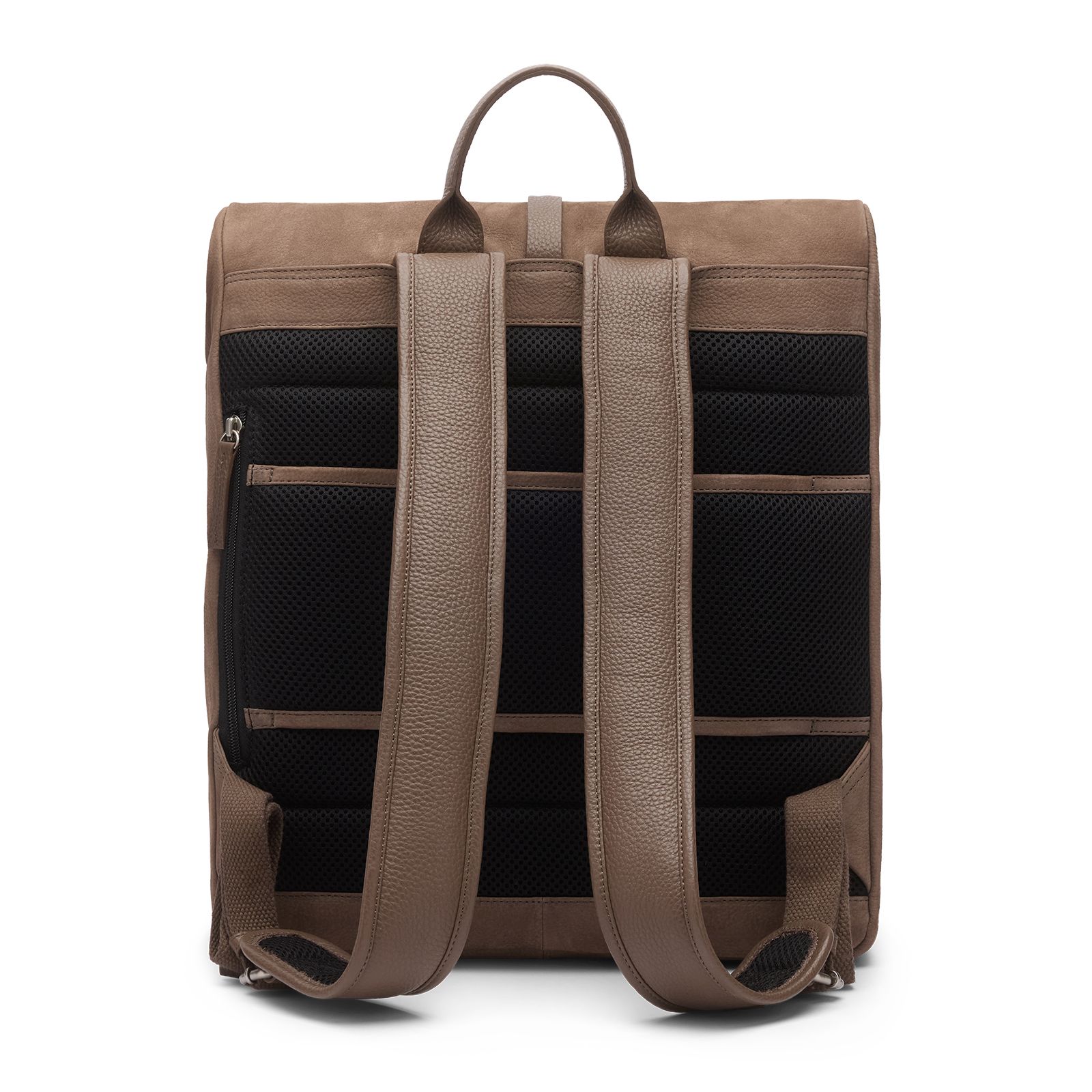 Taupe nubuck rugzak van Manfield. De rugzak heeft een flap met gespsluiting en verstelbare banden voor op de rug. De afmeting van de tas is 33x39x11 cm (BxHxD). We adviseren als verzorging en bescherming de Collonil Carbon Pro.
