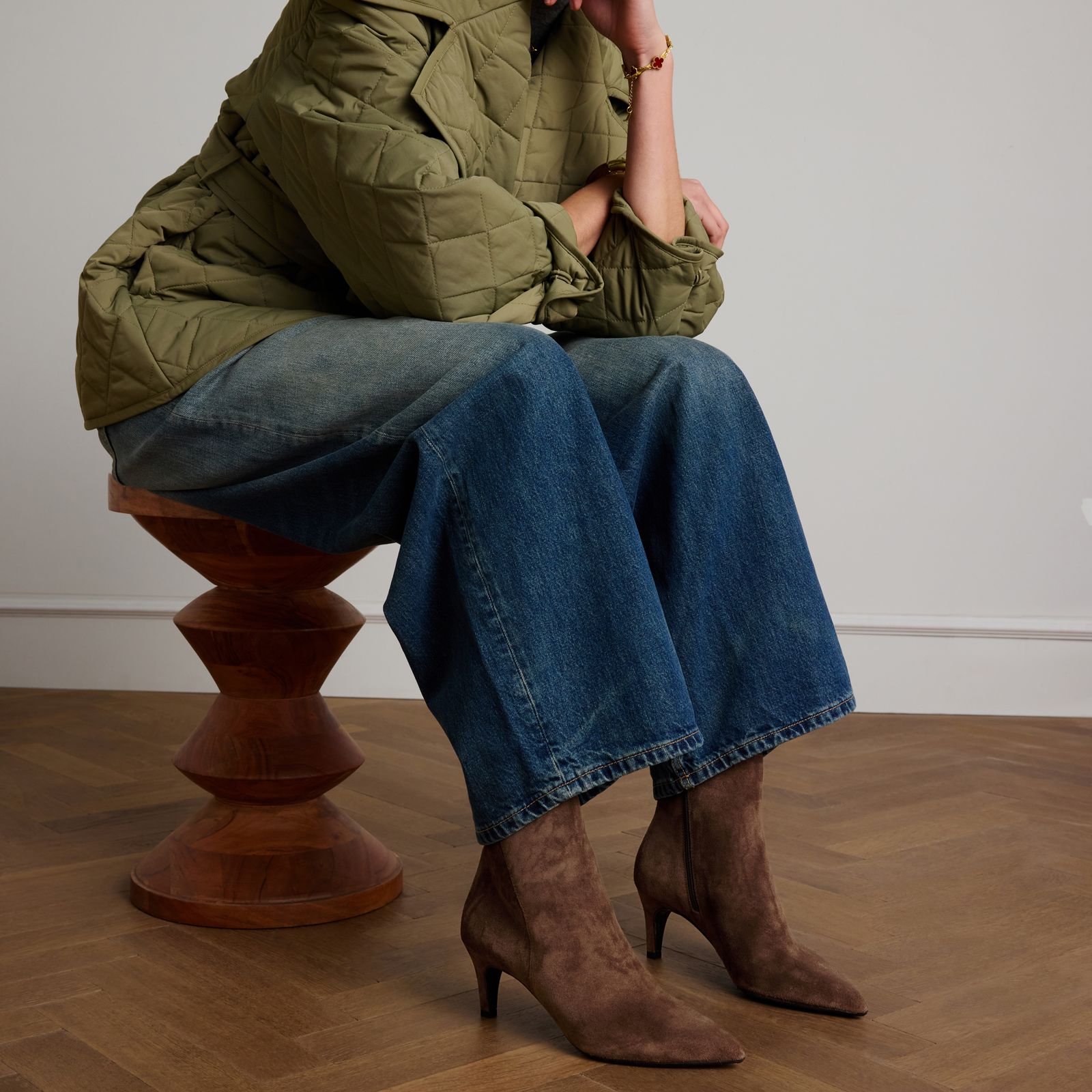 Taupe suède enkellaarsjes met hak van Manfield. De enkellaarsjes hebben een hak van 7 cm, een puntige neus en een ristaansluiting aan de binnenzijde. We adviseren als bescherming en verzorging de suède/nubuck spray in bruin.