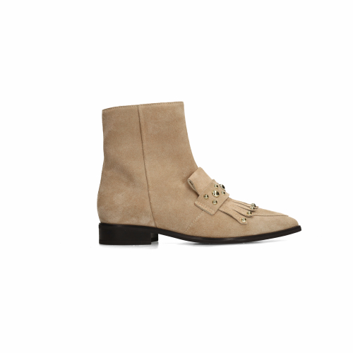 Taupe suède enkellaarsjes met studs van Manfield. De enkellaarsjes hebben een puntneus, ritssluiting aan de binnenzijde en platte hak van 2 cm. We adviseren als verzorging en bescherming de suède/nubuck spray in transparant.