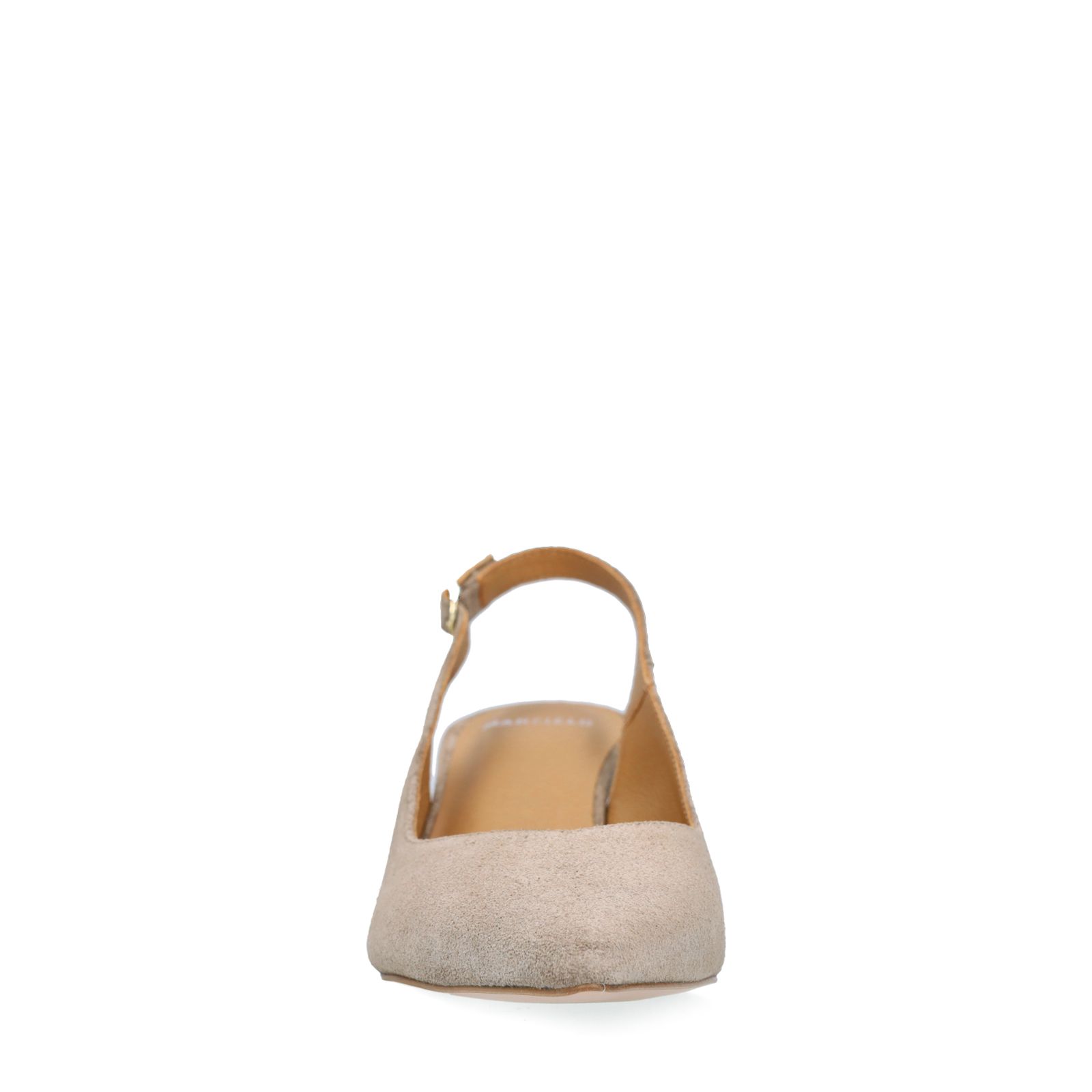 Taupe suède slingbacks van Manfield met een kitten heel van 5 cm, een gespsluiting rondom de enkel en een vierkante neus. We adviseren als verzorging en bescherming de suède/nubuck spray in transparant.