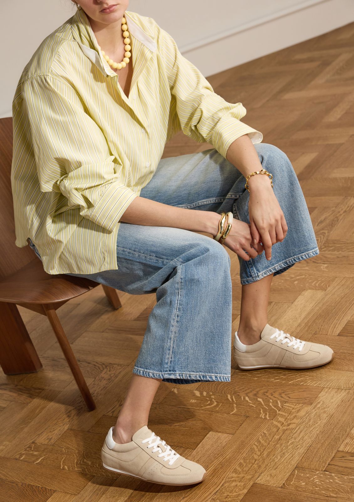 Taupe suède sneakers van Manfield. De sneakers hebben een platte zool van 1 cm en één paar gekleurde veters in de schoen zitten die afgewisseld kunnen worden. We adviseren als verzorging de suède/nubuck spray in transparant.