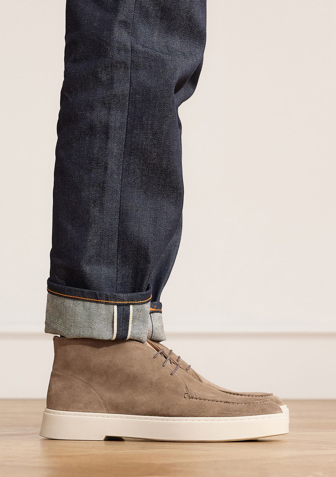 Taupe suède veterboots van Manfield met een witte dikke zool van 3 cm. We adviseren als bescherming en verzorging de suède/ nubuck spray in transparant.