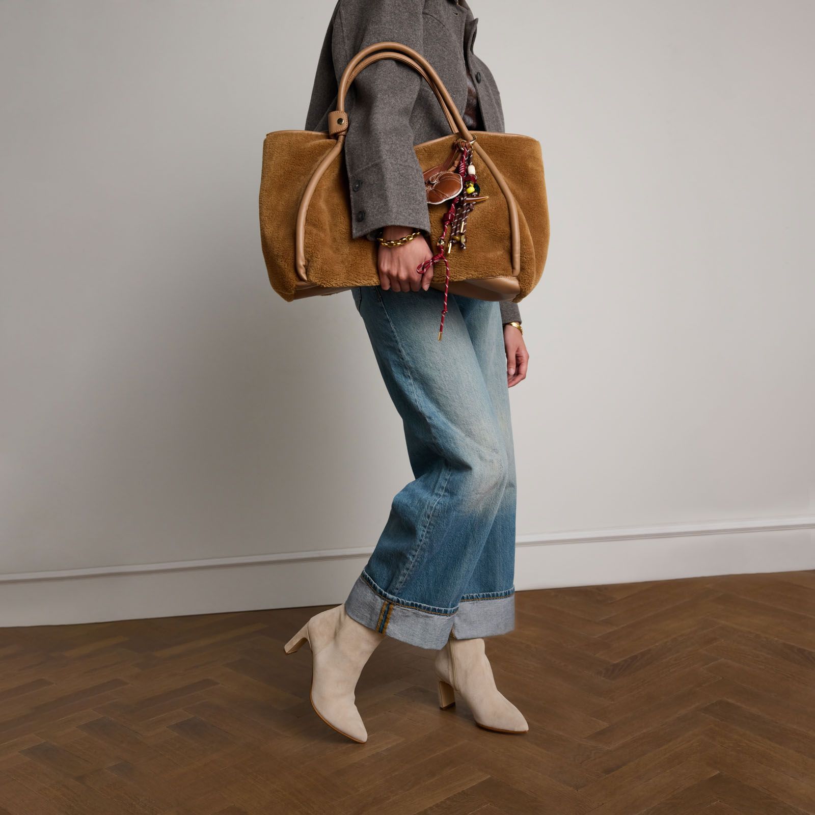 Teddy cognac shopper van Manfield. De shopper heeft een drukknoopsluiting en de afmeting van de tas is 52x31x16 (BxHxD).