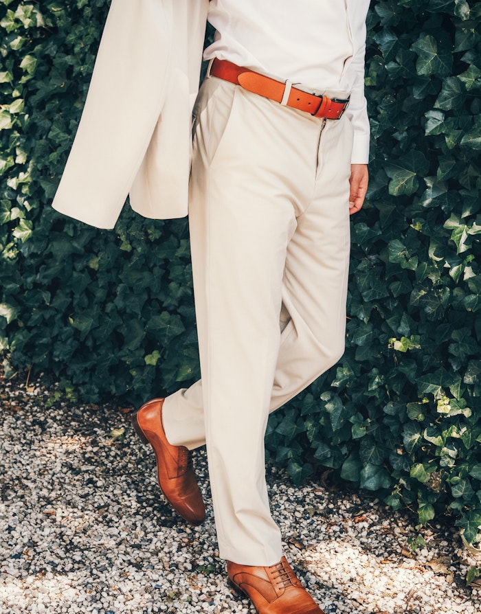 Een beige pak stijl je perfect af met een cognac leren gespschoen, loafer of veterschoen in combinatie met een riem in cognac.