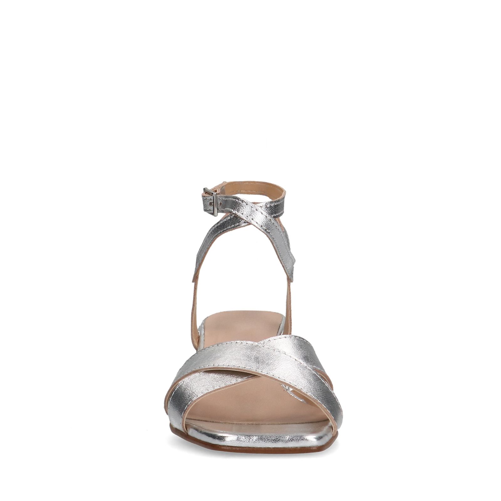 Zilveren leren sandalen met hak van Manfield. Deze hakken hebben een blokhak van 6 cm en gespsluiting rondom de enkel. We adviseren als verzorging en bescherming de Collonil Carbon Pro.