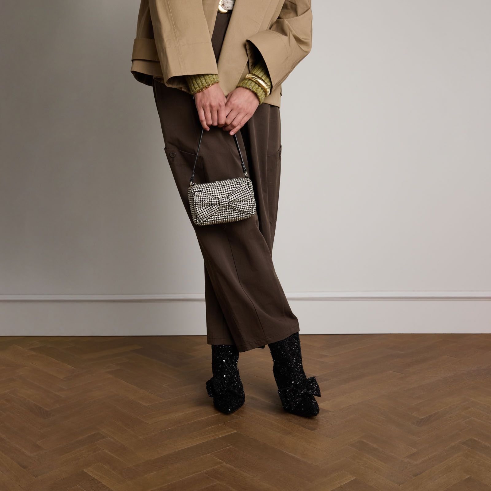 Zwarte glitter enkellaarsjes met hak van Manfield. De enkellaarsjes hebben een strik op de voorvoet, een ritssluiting aan de binnenzijde en een hak van 7 cm. We adviseren als verzorging en bescherming de Natural Trendspray.