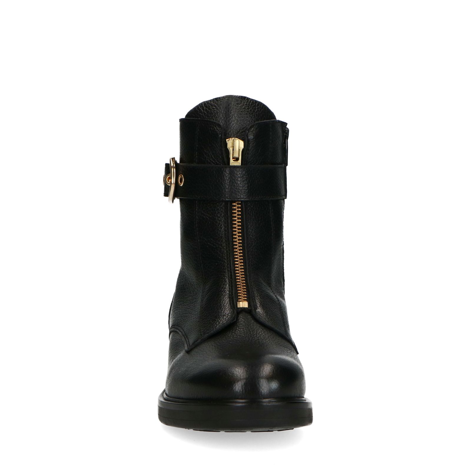 Zwarte leren biker boots van Manfield met platte hak van 3 cm en goudkleurige gesp. De boots hebben een schachthoogte van 16 cm en een schachtbreedte van 28 cm. We adviseren als verzorging en bescherming de Collonil Carbon Pro.