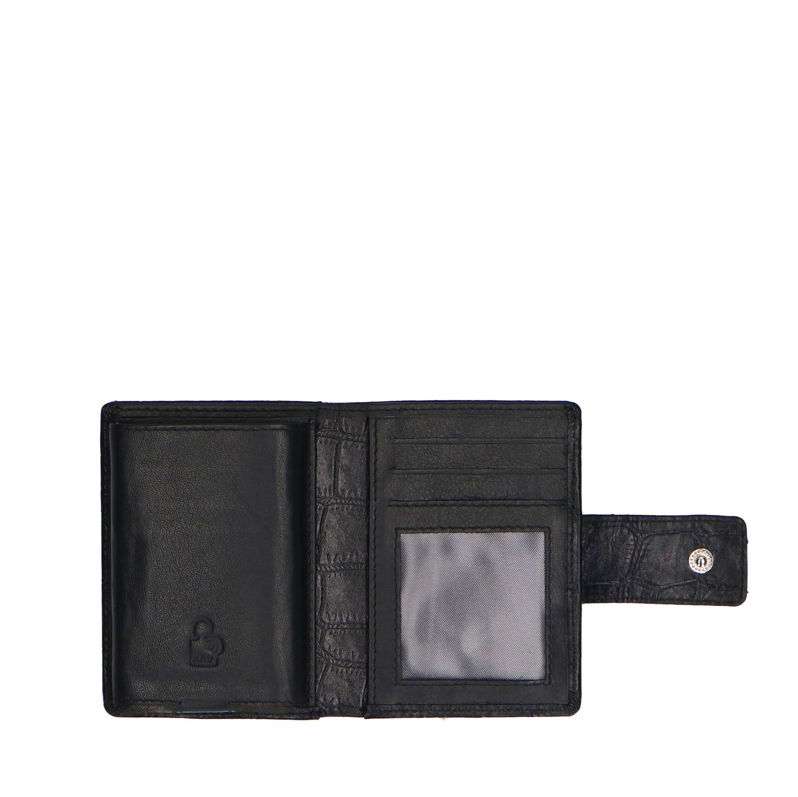 Zwart leren croco pasjeshouder van Manfield. De binnenkant heeft een ijzeren gedeelte, deze is van het merk Figuretta. De pasjeshouder kan gesloten worden door middel van een drukknoopje, is 10 cm lang en 8 cm breed.