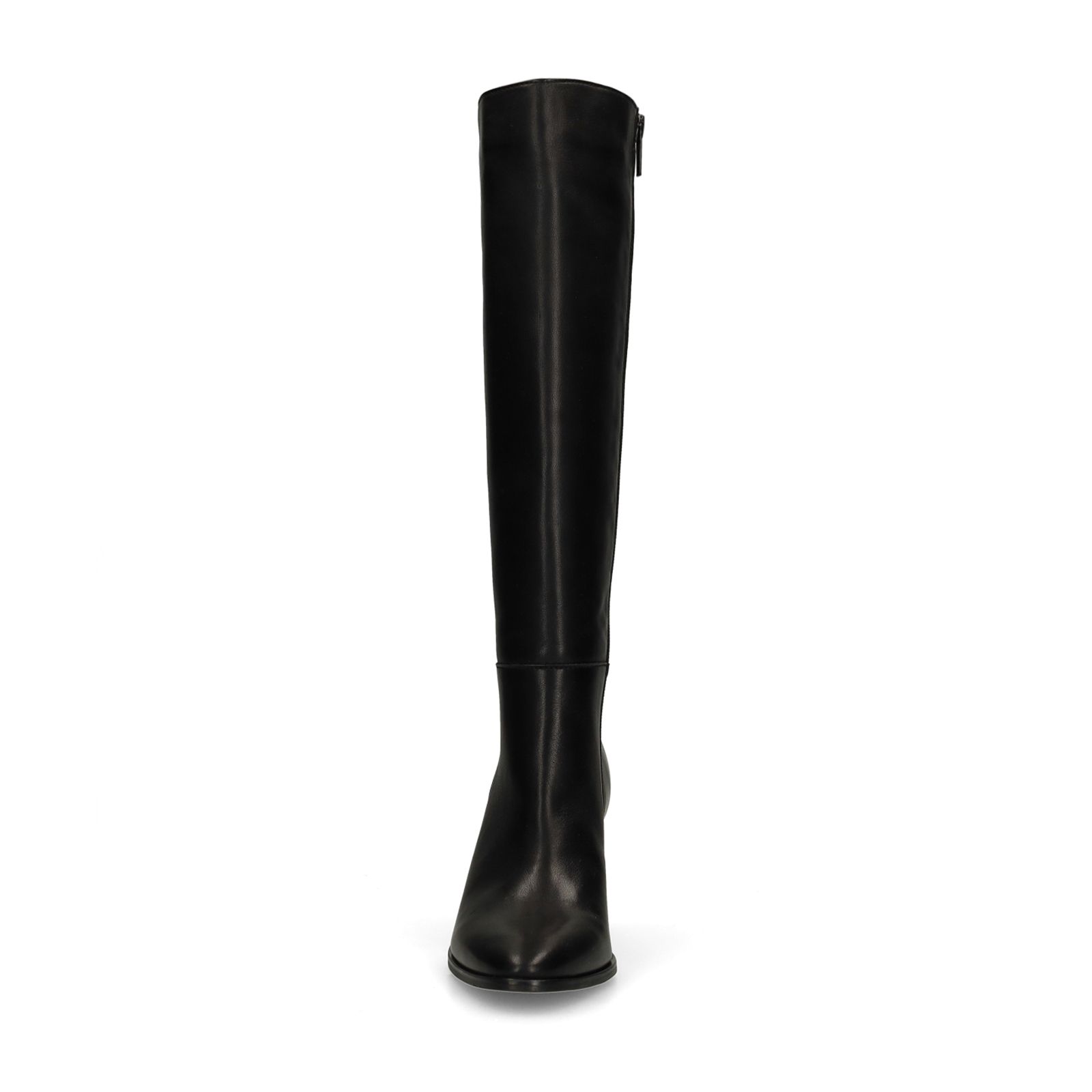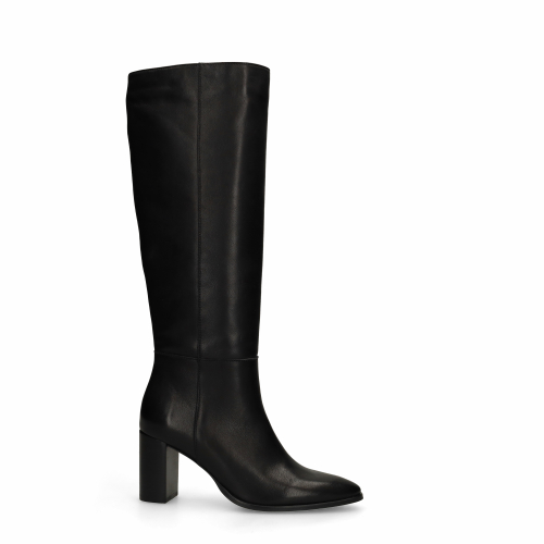 Zwarte leren hoge laarzen met hak van Manfield. De laarzen hebben een ritssluiting aan de binnenzijde, ronde neus, hak van 7 cm en afwerkende stiksels. De schachthoogte van de laars is 39 cm en de schachtbreedte is ook 39 cm, gemeten bij een maat 37. We adviseren als verzorging en bescherming de Collonil Carbon pro.