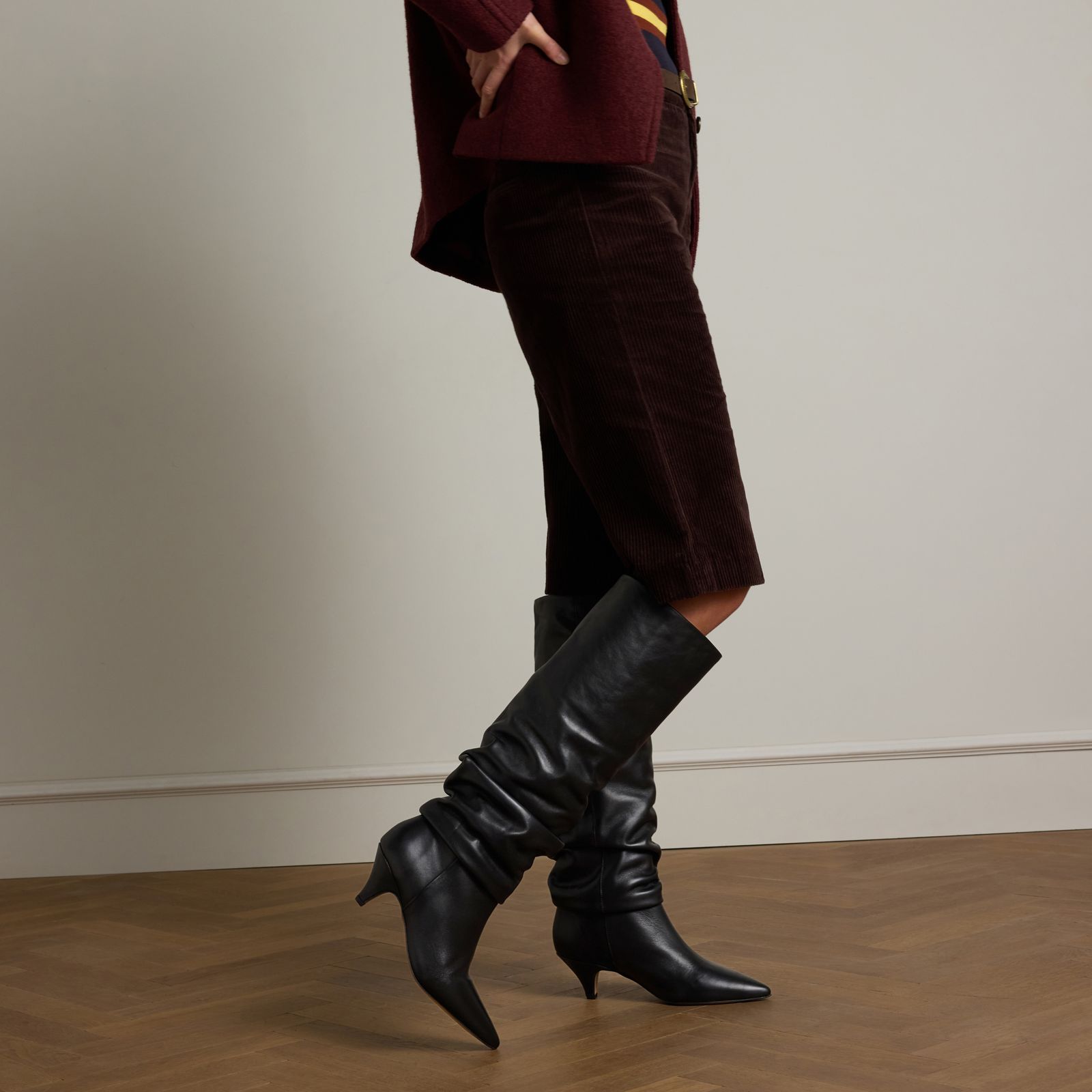 Zwarte leren hoge laarzen met kittenheel van Manfield. Deze instaplaarzen hebben een puntige neus, kittenheel van 4 cm en afzakeffect. De schachthoogte is 43 cm en de schachtbreedte is 38 cm, gemeten bij een maat 37. We adviseren als verzorging en bescherming de Collonil Carbon pro.