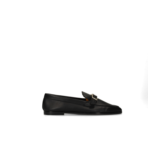 Zwarte leren loafers met goudkleurig detail van Manfield. De loafers hebben een platte hak van 1 cm. We adviseren als verzorging en bescherming de Collonil Carbon Pro.