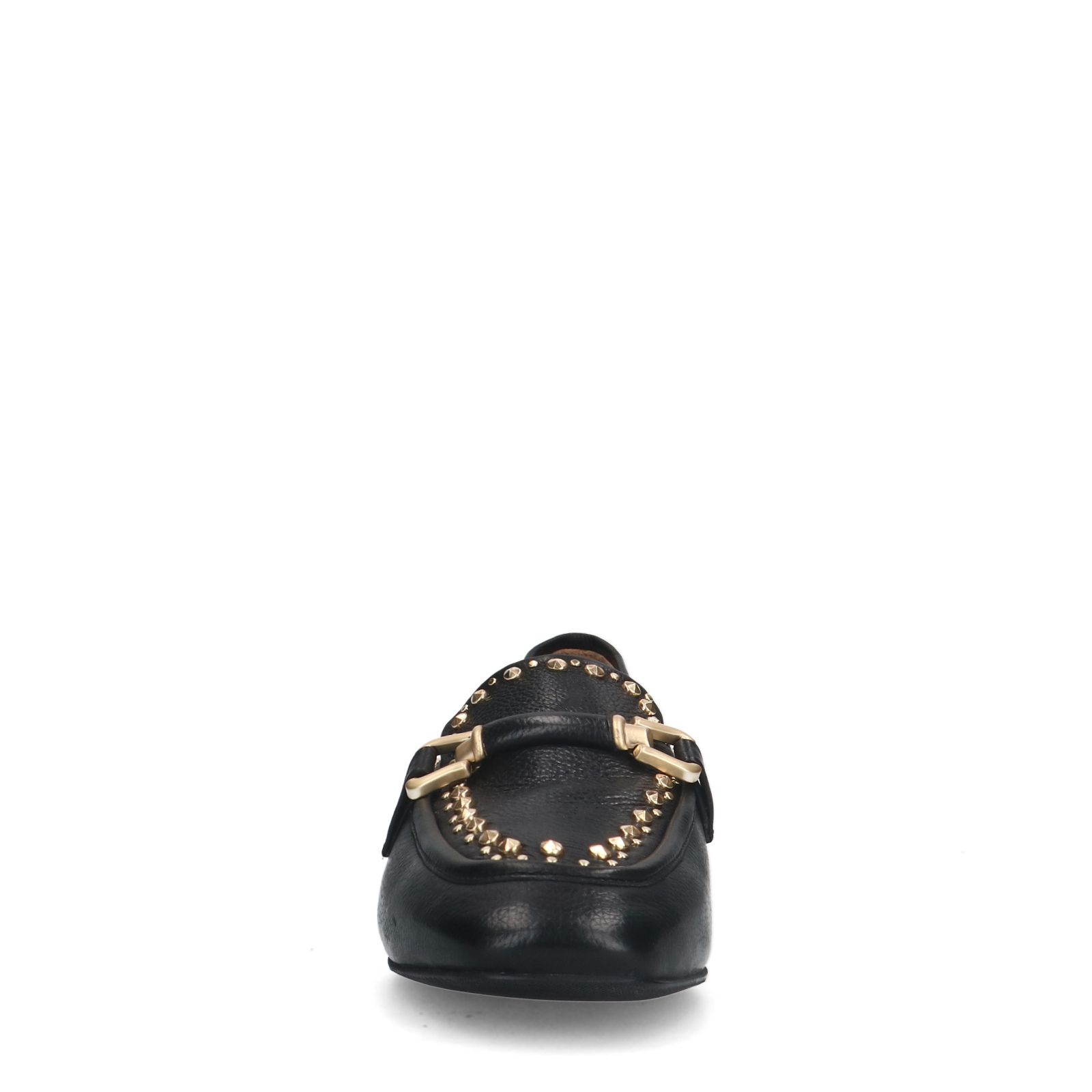Zwarte leren loafers met goudkleurige studs van het merk Manfield. Zowel de buiten- als binnenzijde is gemaakt van leer en de loafer heeft een platte hak van 1 cm. We adviseren als verzorging en bescherming de Collonil Carbon Pro.