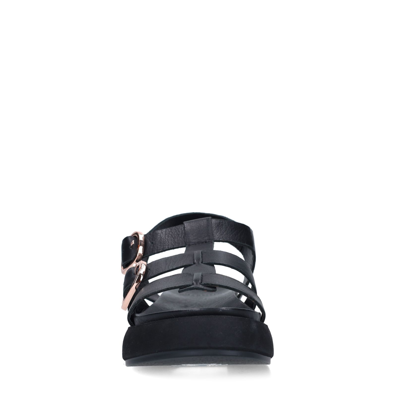 Zwarte leren sandalen van Manfield. De sandalen hebben een plateauzool van 4 cm en met gespsluiting. We adviseren als verzorging en bescherming de Collonil Carbon Pro.