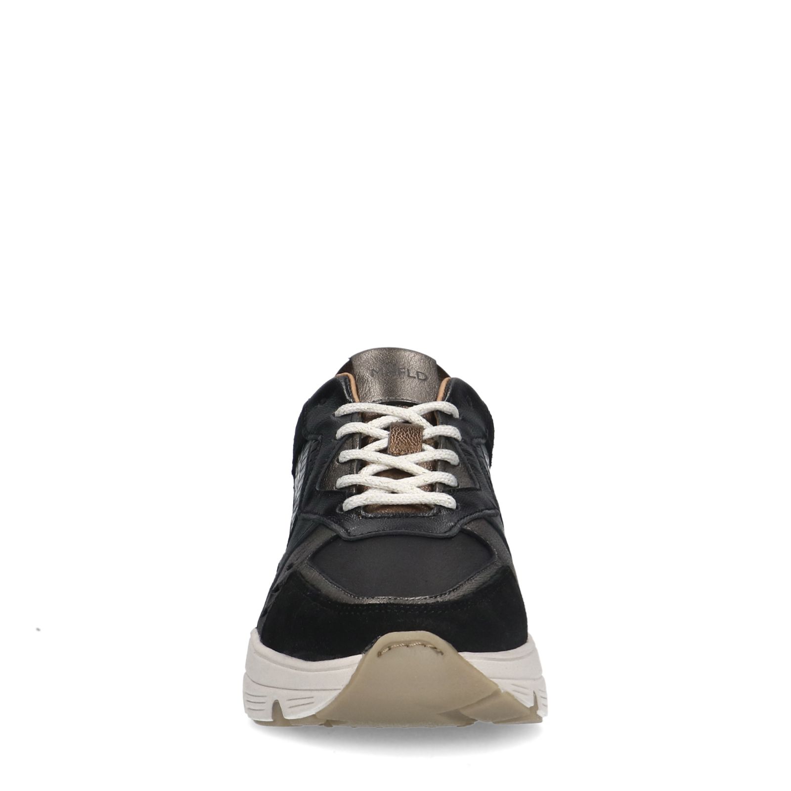 Zwarte leren sneakers met suède details van Manfield. Deze sneakers zijn gemaakt van leer en daarom raden we je aan deze sneakers te verzorgen en beschermen met de Collonil Carbon Pro. Deze sneakers zijn voorzien van metallic details in brons en zilver. De witte chunky zool zorgt voor extra volume.