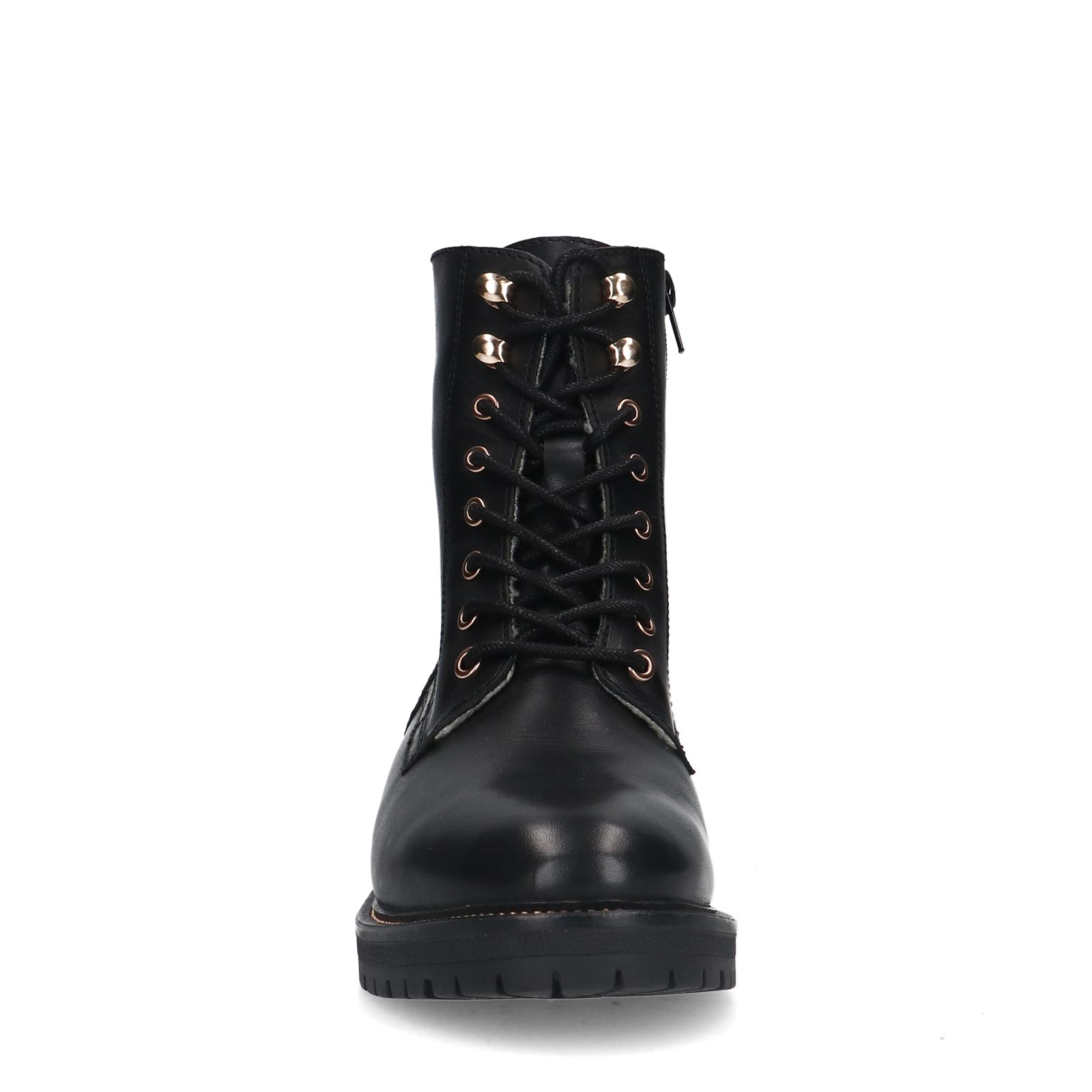 Zwarte leren veterlaarsjes van Manfield met platte hak van 3 cm en binnenzijde met zachte voering. De laarsjes hebben een schachthoogte van 16 cm en een schachtbreedte van 27 cm. We adviseren als verzorging en bescherming de Collonil Carbon Pro.