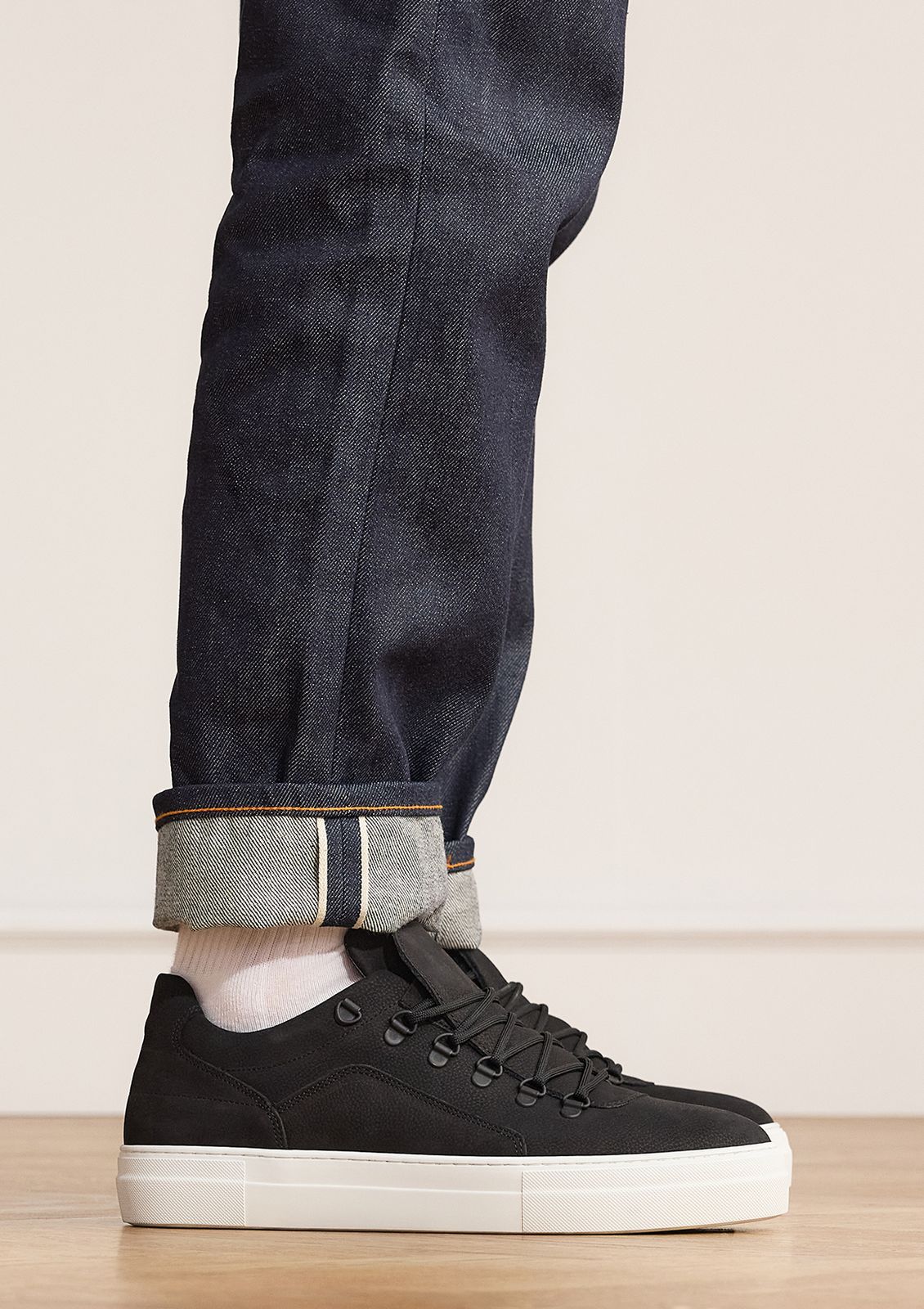 Zwarte nubuck sneakers van Manfield met vetersluiting en witte plateauzool van 4 cm. We adviseren als verzorging en bescherming de Collonil Carbon Pro spray.