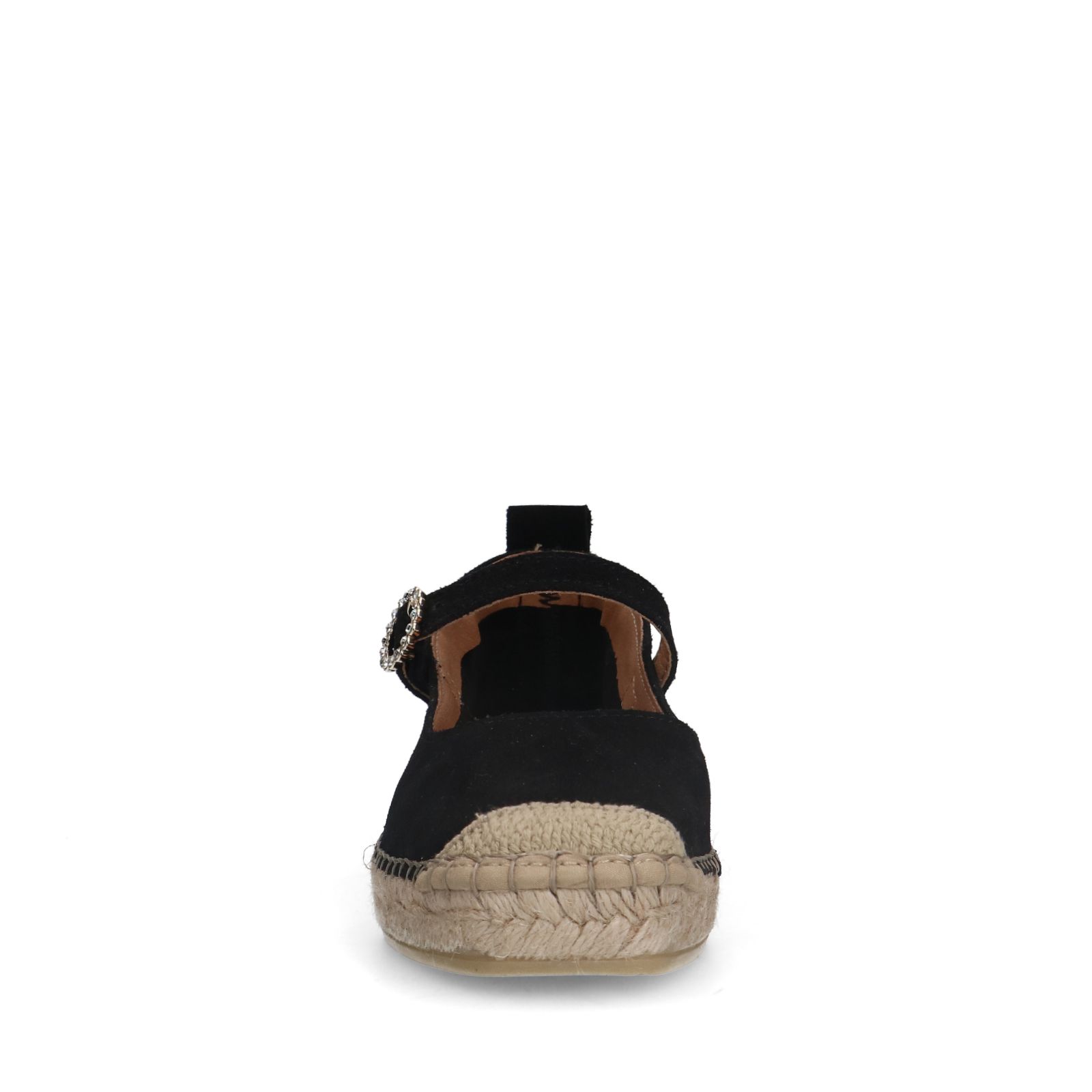 Zwarte suède espadrilles met gesp van Manfield. Deze espadrilles hebben een zool van 2 cm, we adviseren als verzorging en bescherming suède/nubuck spray in transparant.